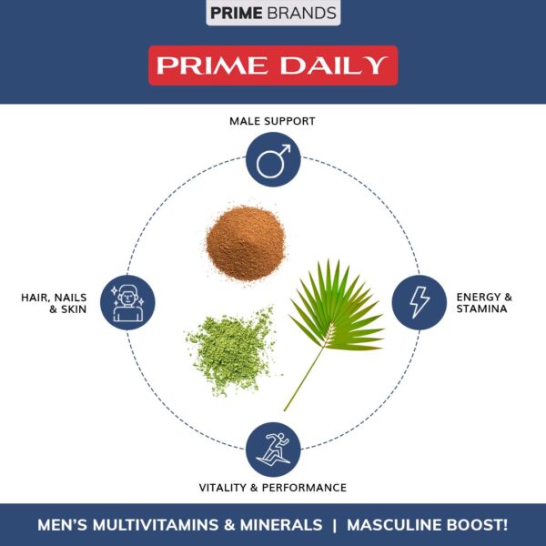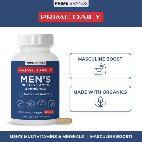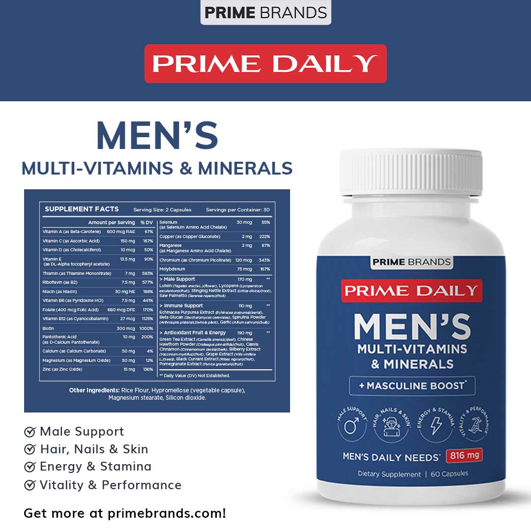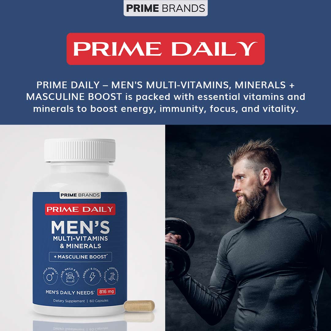 PRIME DAILY – MEN’S MULTI-VITAMINS, MINERALS + MASCULINE BOOST provides a balanced blend of essential vitamins, minerals, antioxidants, and special herbs designed to meet men’s unique nutritional needs. In today’s fast-paced lifestyle, many men fall short of the recommended daily intake of key nutrients. PRIME DAILY helps bridge that gap by supporting immune health, boosting energy, and promoting mental focus. With targeted nutrition made specifically for men, it gives your body exactly what it needs to thrive every day! Essential daily nutrition for men — fueling strength, energy, and focus while supporting a natural masculine boost.